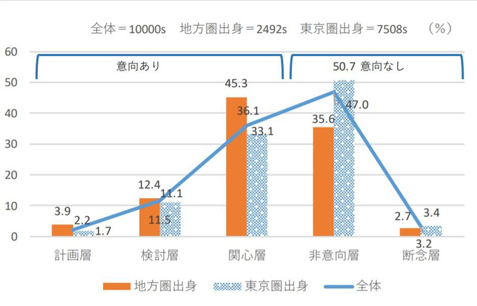 関心層から断念層までの5層の平均年齢を比べると、非意向層が最も高く(41.3歳)、関心層/検討層はほぼ同齢(40.1歳/40.3歳)、計画層が最も低く(35.7歳)、意向が高まるほど平均年齢が若くなる傾向が見られた。これは地方圏出身、東京圏出身ともに同じ傾向だという。