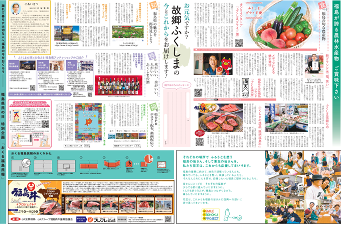 今回の紙面は、「福島わらじまつり」「郡山うねめまつり」「東山盆踊り」「相馬野馬追」「じゃんがら念仏踊り」などをモチーフとして“本来の福島”を思い出させるデザインとなっている。