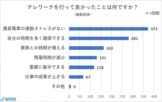 対象者500人に、新型コロナウイルス影響下でテレワークを行った理由を尋ねた質問には、「会社からの指示」の回答が77%であった。また、テレワークを行って良かったことは、「満員電車による通勤ストレスがない」が1位となった。