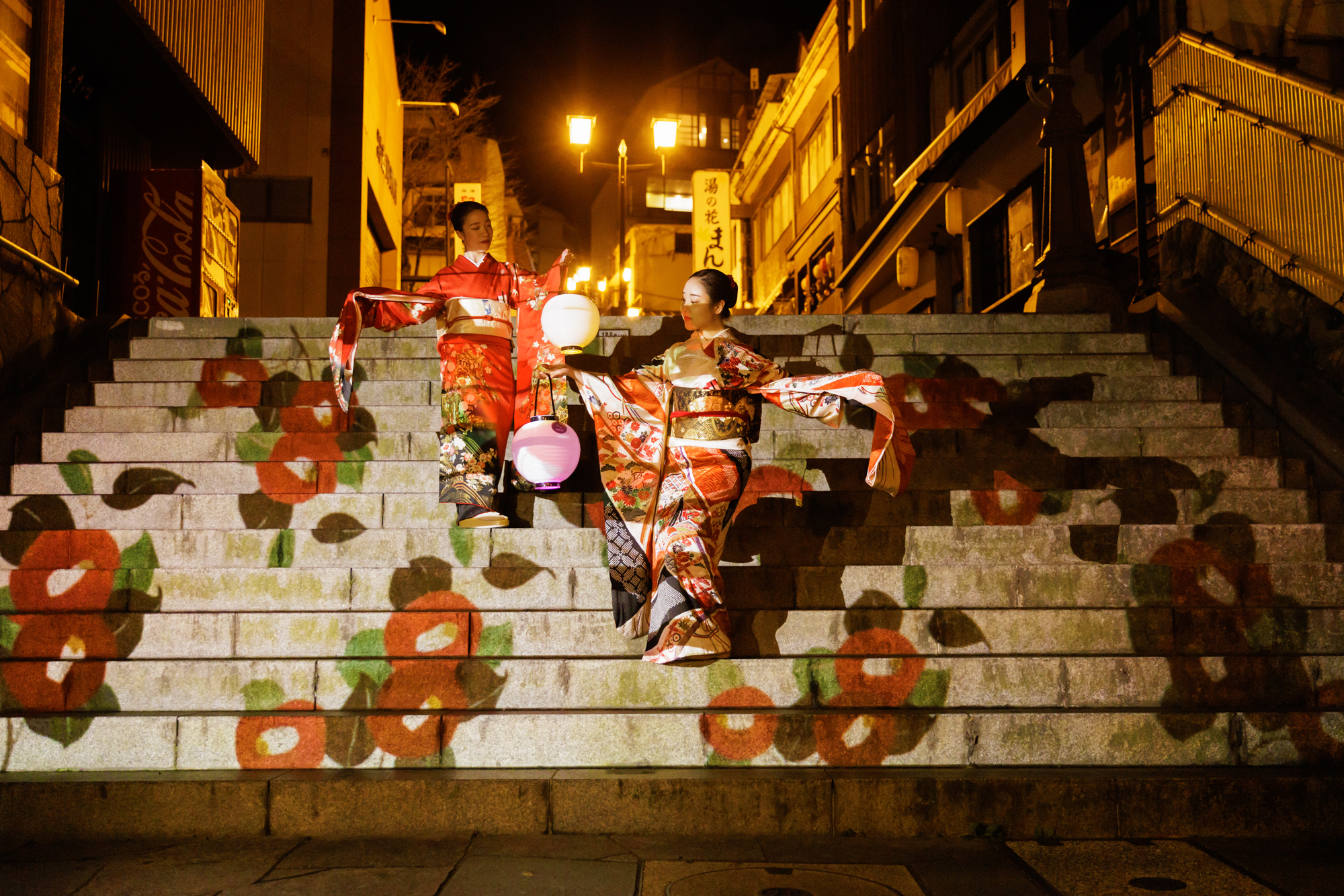 365段ある石階段を使った壮大なプロジェクションマッピング。伊香保の四季を楽しめるほか、画家・詩人の竹久夢二氏の作品とコラボした大正ロマンなデザインなども展開。